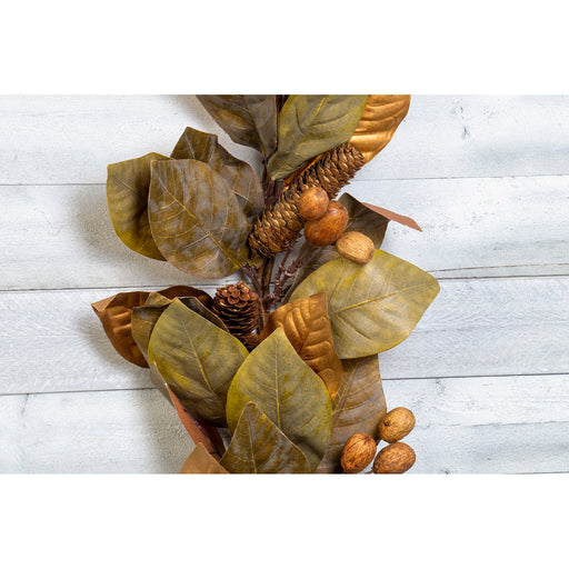 This artificial magnolia garland is crafted with silk and plastic material. Its fine details and color make it look just like real magnolia leaves....