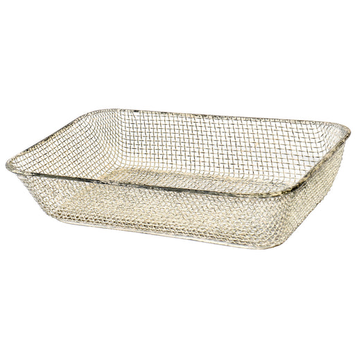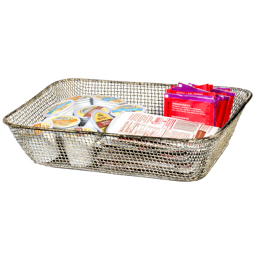 This metal woven wire table basket measures 11½"W x 8½"D x 2½"H. It is made of metal and can be used in a variety of ways. Accessories not included...