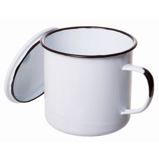 Useful and trending set of 3 enamelware white mug/ pots with colored rim and lids. Perfect for camping, picnics and outdoor activity - a perfect wa...