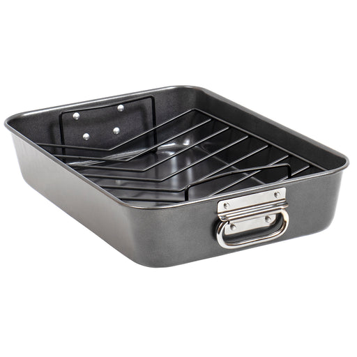 High quality heat resistant metal roasting pan and rack. This pan is great for cooking enthusiasts. Roast chicken, turkey, ham, steaks. Rectangular...