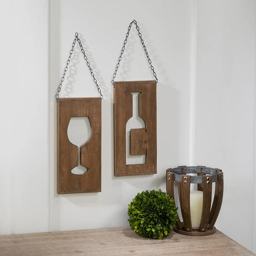 This wonderful wall art set features one plaque with a cutout wine bottle and a second plaque with a cutout wine glass, and metal chains for easily...