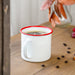 - A classic set with a smooth, enameled white surface and red rim to complement vintage, shabby chic, antique, cottage, farmhouse, and country living décor.