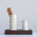 - Pitcher is made of glossy ceramic stoneware with hand-painted yellow cream stripes