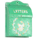 - A mint-colored mailbox with “LETTERS” and a bird and floral vine motif embossed in white; the surface is an intentionally aged and faded for an antique look