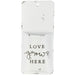 - This farmhouse wall pocket is made of metal; its white enamel coating has distressed finish with black lettering that reads “LOVE GROWS HERE.”