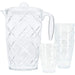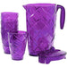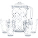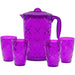 This wonderful pitcher set can be used for many types of liquid beverages such as iced tea and fruit infused juices, kool-aid for the kids and so much more — ideal for use at home or even outdoors for serving ice cold drinks on the patio with all your guests during spring and summer events. Lightweight and easy to use for pouring drinks one-handed, ideal for use at home, in the office, or even outdoors for serving ice cold drinks on the patio with all your guests — great for patio, poolside, BBQ, picnic, and other outdoor use, but still pretty enough for indoor entertaining. Features a dripless pouring spout, a dustproof cover to keep things clean, a lid that pops open with a push-button for easy refills, and convenient comfortable handle. Made of high grade food safe plastic with stylish diamond cut design — COLORS MAY VARY — (Bisphenol A) BPA Free and Lead Free — Does not contain substances harmful to health — Wash before use. Set of FOUR drinking glasses and ONE large jug with spout and handle — tumblers measure approximately 3¼" dia x 5" tall with a capacity of up to 12 fluid ounces (roughly 355mL or 1½ cups) — pitcher measures approximately 5.5" x 4.5" x 9.25" with a capacity of up to 64 fluid ounces (roughly 1.9 liters, 8 cups, 4 pints, 2 quarts, ½ a gallon, or 1893mL).
