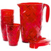 - Set of FOUR drinking glasses and ONE large jug with spout and handle — tumblers measure approximately 3¼" dia x 5" tall with a capacity of up to 12 fluid ounces (roughly 355mL or 1½ cups) — pitcher measures approximately 5.5" x 4.5" x 9.25" with a capacity of up to 64 fluid ounces (roughly 1.9 liters, 8 cups, 4 pints, 2 quarts, ½ a gallon, or 1893mL)