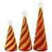 • Made of high-quality textured glass, each figurine features a conical tree design with spiral swirls in red and golden finish with glittering gold beads, a crystal-clear star at the top, and one warm white LED light inside.
