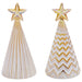 - Made of high-quality textured glass, each figurine features a conical tree in wash-white finish with raised geometrical pattern, champagne yellow star at the top, and one warm white LED light inside.