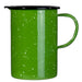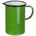 - A gorgeous green enamel features white speckle accents. A handle makes it easy to pour beverages.