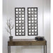 This unique mirror is made up of many mini-mirrors with a metal frame. The frame features a rubbed, gunmetal finish for a distinctly industrial look. Use the mirror in your foyer, entryway, bedroom or any other room to add an elegant industrial touch. Use multiples of the mirror for a dramatic effect — each mirror hangs vertically and features two keyholes in the top back corners for hanging. Set of TWO each measure approximately 14.25" W × 1.2" D × 40.15" H.