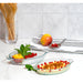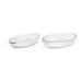This oval glass dish is a perfect addition to your kitchen. The set comes with 2. The large dish measures 8.5" (10.25" with handles) x 6" wide x 1.5" H and the small dish measures 8" (9.5" with handles) x 5" wide x 1.5" H. Made of thick durable glass, these oval serving dishes are great for serving a lovely pasta dish during dinner time, or some delicious chicken wings at the family barbecue.