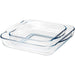 High quality heat-resistant glass bakeware set for microwave and oven. Glass is healthier than metal and plastic — it will not warp, stain, retain smells, or leach dangerous chemicals into food, so you can worry less and make it easier to monitor food while cooking. Ideal for casseroles, small roasts, fish, stews and so much more — a perfect housewarming gift for bachelors or newly-weds or for any occasion. SAFE for use with MICROWAVE / OVEN / REFRIGERATOR / FREEZER / DISHWASHER — BPA FREE — PVC FREE — Does not contain substances harmful to health — Wash before use. Measures approximately 11" x 11" (280 mm x 280 mm) with a smaller dish measuring 8.75" x 8.75" (220 mm x 220 mm)
