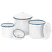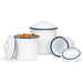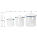 - Useful and trendy SET OF 3 enamelware containers in white with BLUE rim and lids