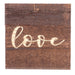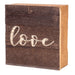 - Design: "love" in white script on espresso finish background — Measures approximately 6" x 6" x 1.75"