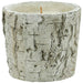 - This candle comes in a round ceramic jar with a lifelike birch-bark texture in whitewash finish with wood chip embellishments.