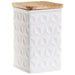 - This candle comes in square white ceramic canister with wooden lid. PLEASE NOTE: Candles are randomly selected, so designs on the ceramic canister will vary.