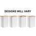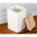 - This candle comes in square white ceramic canister with wooden lid. PLEASE NOTE: Candles are randomly selected, so designs on the ceramic canister will vary.
