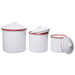 Useful and trending set of 3 enamelware white mug/ pots with colored rim and lids. Perfect for camping, picnics and outdoor activity - a perfect way to steep some tea, eat a soup. Made from metal and coated in enamel - durable and pretty - won't break or get damaged. Use for decorative purposes to display floral's, plants, small utensils, garden tools. Will fit any vintage and farm cottage home decor. Contains 3 nesting containers, each with lid. Dimensions: L - 4.5" H x 5" Dia, M - 3.75"H x 4.5" dia, S - 3" H x 3.5"dia.